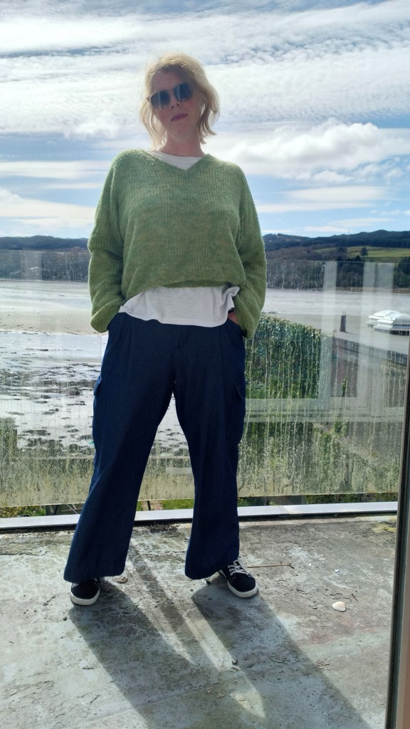 Finally managed to dry out the denim trousers, so wearing these today with the green Dazy jumper, white long-sleeve t-shirt and trench coat.