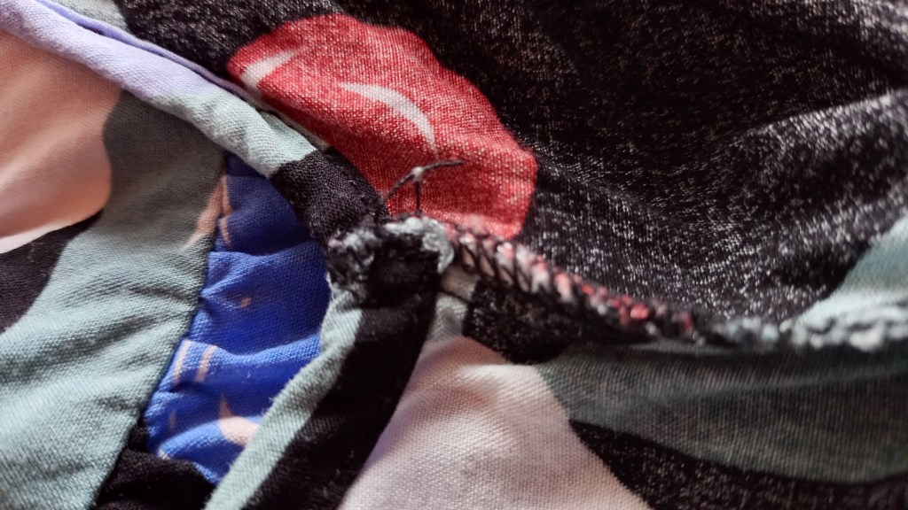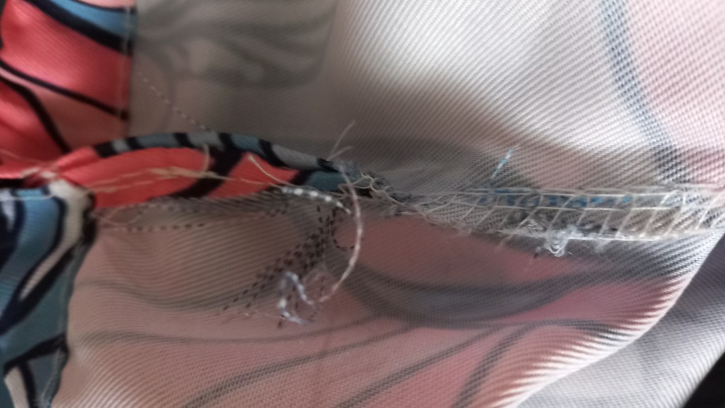 - Nightdress: Seams are stitched and then reinforced with an overlock. There are clumps of stitching, and some areas where the overlock is coming away from the fabric.